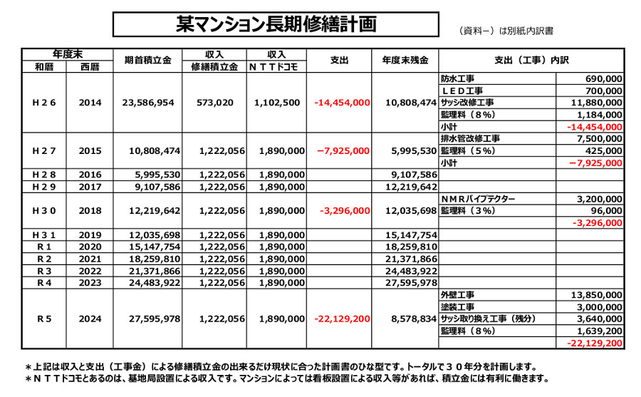 ひどい事例としては、本マンションには存在していない項目があったり、修繕する必要もない(例えば、ステンレス管を使用した連結送水管の全取り換えなど)大きな金額が計上されているものを見たことがあります。